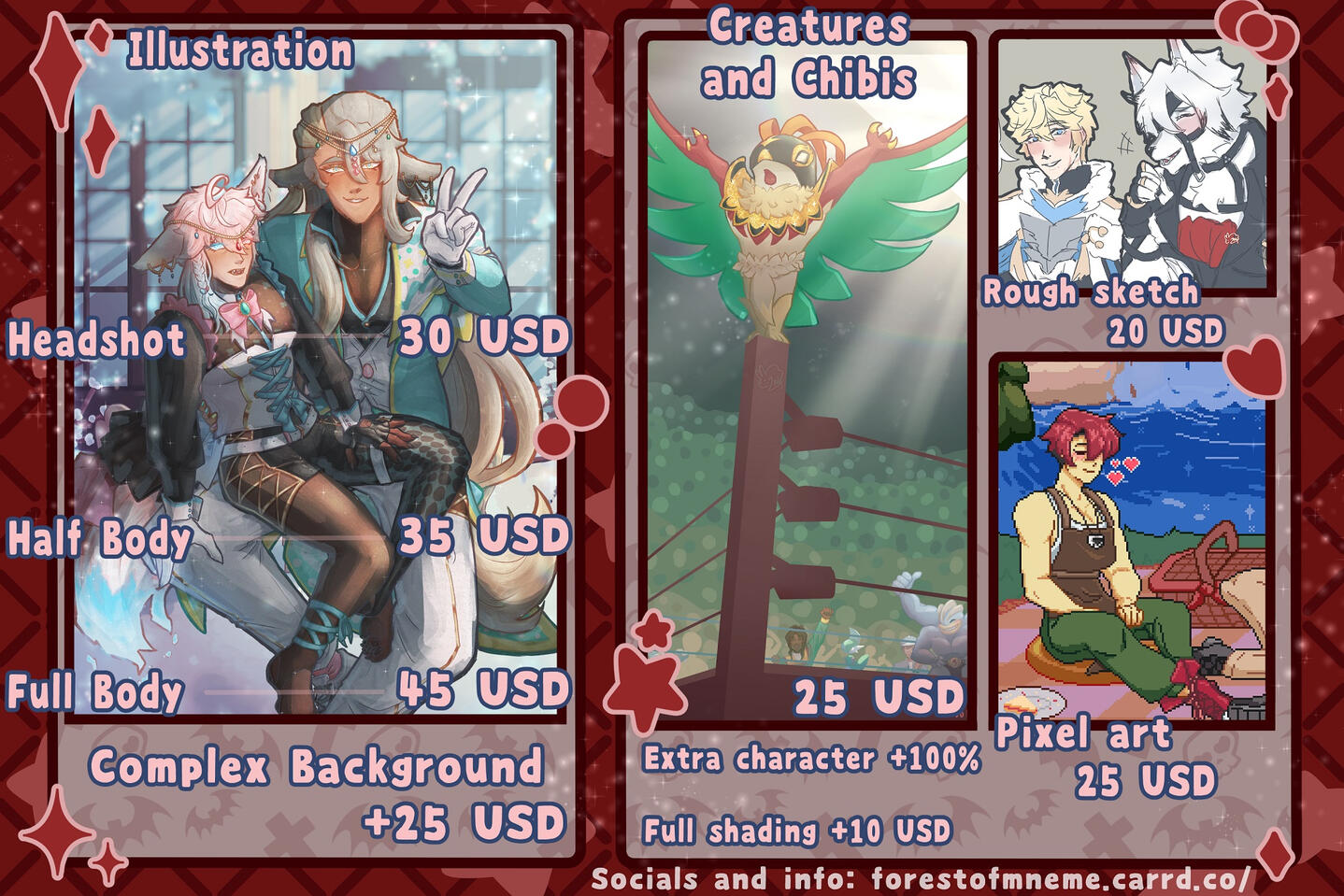 *Detailed characters are highly ornate without simplification. Like Genshin or FFXIV characters. If you want me to simplify their designs, you don't need to pay the extra fee.**What constitutes as a creature (to me):